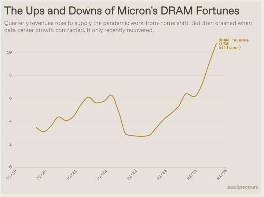 电子行业是如何陷入如今这般困境的?更重要的是,它又该如何摆脱困境?IEEE Spectrum采访了经济学家和存储器专家,请他们对此进行解释。他们认为,如今的局面是 DRAM 行业历史上长期存在的繁荣与衰退周期,以及规模空前的 AI 硬件基础设施建设相互碰撞的结果。而且,除非 AI 领域出现重大,否则新增产能和新技术需要数年时间才能使供应与需求相匹配。即便如此,价格也可能依然居高不下。