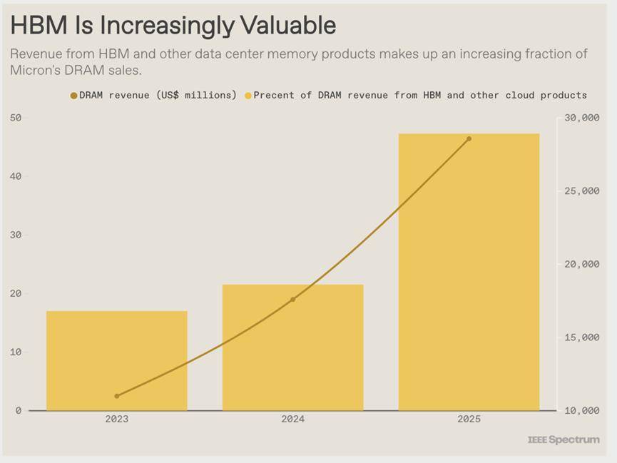 由于需求旺盛,HBM在DRAM制造商的收入中所占比例越来越高。美光(Micron,排在SK海力士和三星之后的第三大DRAM生产商)报告称,HBM和其他云相关内存产品在其DRAM收入中的占比将从2023年的17%增长到2025年的近50%。